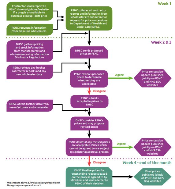 When community pharmacies cannot source a drug at or below the reimbursement price as set out in the Drug Tariff, the Department of Health and Social Care (DHSC) can introduce a price concession at the request of Community Pharmacy England. A price concession can be requested for any drugs listed in Part VIIIA, Part VIIIB and Part VIIID of the Drug Tariff. For any drugs granted price concessions, contractors are automatically reimbursed at the new prices for that month.