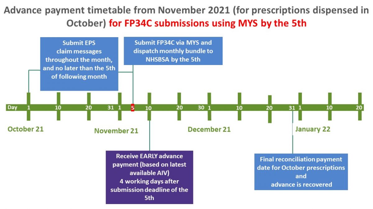 As of November 2021, all community pharmacy contractors can receive earlier advance payments, following agreement between Community Pharmacy England and the Department of Health and Social Care (DHSC). Advance payments are made approximately 20 days earlier than the current payment timetable for contractors who make their monthly FP34C submissions through the Manage Your Service (MYS) portal by the 5th of the month.