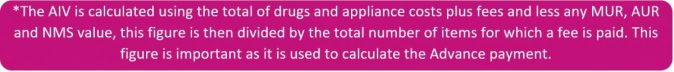 - The Advance payment for the next dispensing month (i.e. the payment on account for the following month, May in this case), which is the total number items declared on that month’s FP34C multiplied by the average item value (AIV). Your advance calculation will appear next to “Payment on account for” but if your batch is registered after advances have been calculated then your payment will appear next to ” Advance payment in respect of a late registered batch”. The calculation remains the same.
