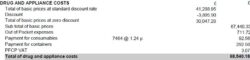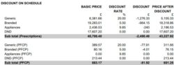 The ‘drug and appliance costs’ section lists the total value of drugs and appliances as priced by the NHSBSA. It states a sum for all products which attract discount deduction and also details the percentage discount that will be deducted from the total of basic prices at standard discount rate (further details on discount deduction can be found in Part V of the Drug Tariff). It provides a separate figure for zero discount items which have no discount deducted.