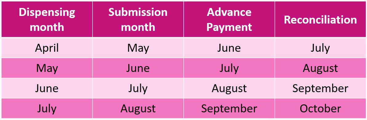 For example, June payment will comprise of the 100% estimated Advance payment for prescriptions submitted in May (dispensed in April) with the full value of the priced prescriptions less the recovery of the estimated 100% Advance payment for prescriptions submitted in April (dispensed in March). Normal payment option timeline: