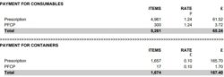 This section shows a breakdown for Consumables and Containers for both regular prescriptions and PFCP. The total items and payment value should match the number of Consumables and Containers and payment for Consumables and Containers value on page one.
