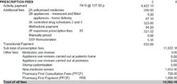 The ‘prescription fees’ section gives a breakdown of all the prescription related fees the contractor will be paid for the month. This includes the total value for the Single Activity Fee (displayed as activity payment) which is calculated by multiplying the SAF rate by the number of prescription items. Other fees outlined here include unlicensed medicines, appliances, Controlled drugs (Schedule 2 and 3) and expensive items. A breakdown of Medicine Use Reviews (MURs), Appliance Use Reviews (AURs), Stoma customisation and New Medicines Service (NMS) is also included here.