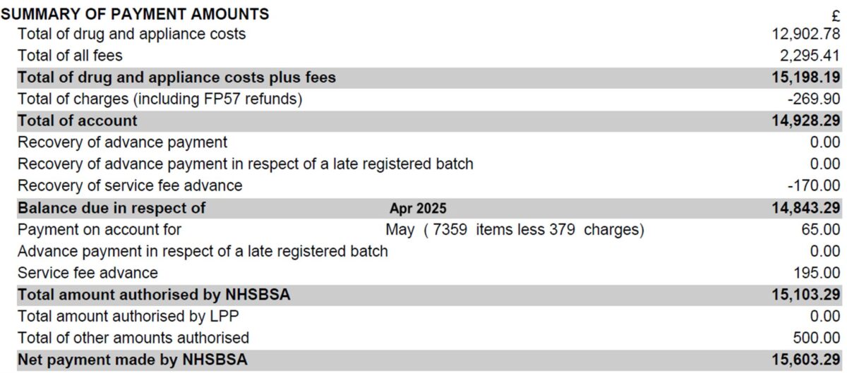 The ‘Summary of Payment Amounts’ includes the total value of drugs and appliances dispensed, fees and allowances received, and the value of the prescription charges retained by the contractor (i.e. prescription charges received minus refunds). This section also includes the following: