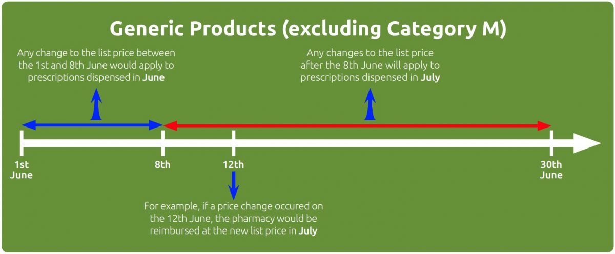 For non-proprietary or generic products (excluding products in Part VIIIA Category A & M) the reimbursement price change takes place one month earlier than proprietary products. For example, if the manufacturer’s list price changed on the 6th of June, the new reimbursement price would apply to prescriptions dispensed in June. If a manufacturer’s list price for a generic drug changed on the 15th June, the new reimbursement price would apply to prescriptions dispensed in July.