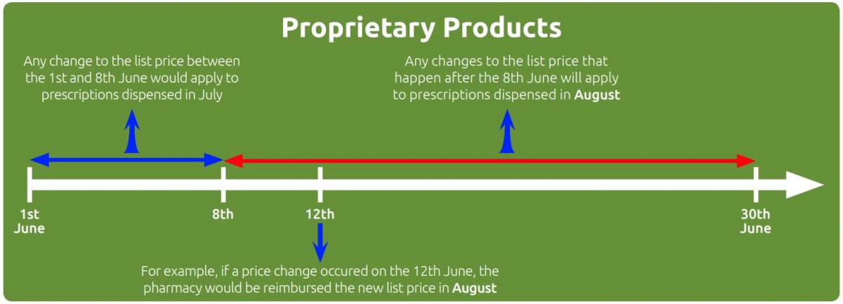 For example, if the manufacturer’s list price for a proprietary product changed on the 6th of June, the new reimbursement price would apply to prescriptions dispensed in July. If a manufacturer’s list price changed on the 15th June, the new reimbursement price would apply to prescriptions dispensed in August.